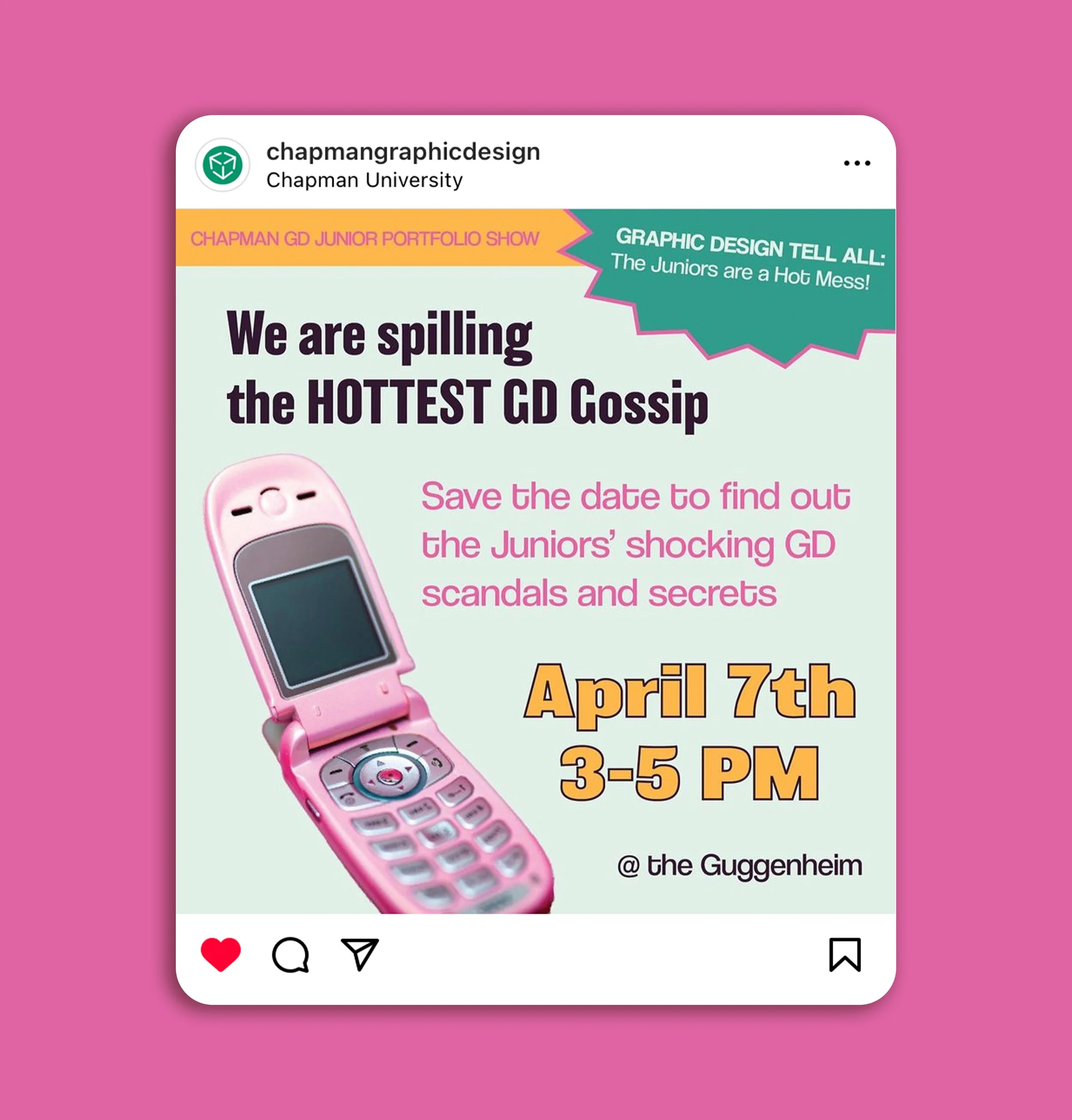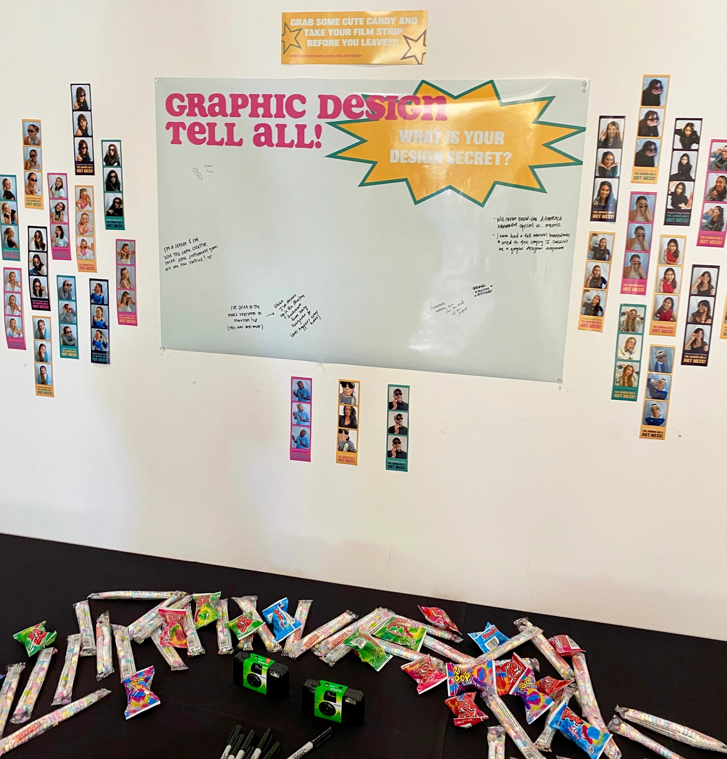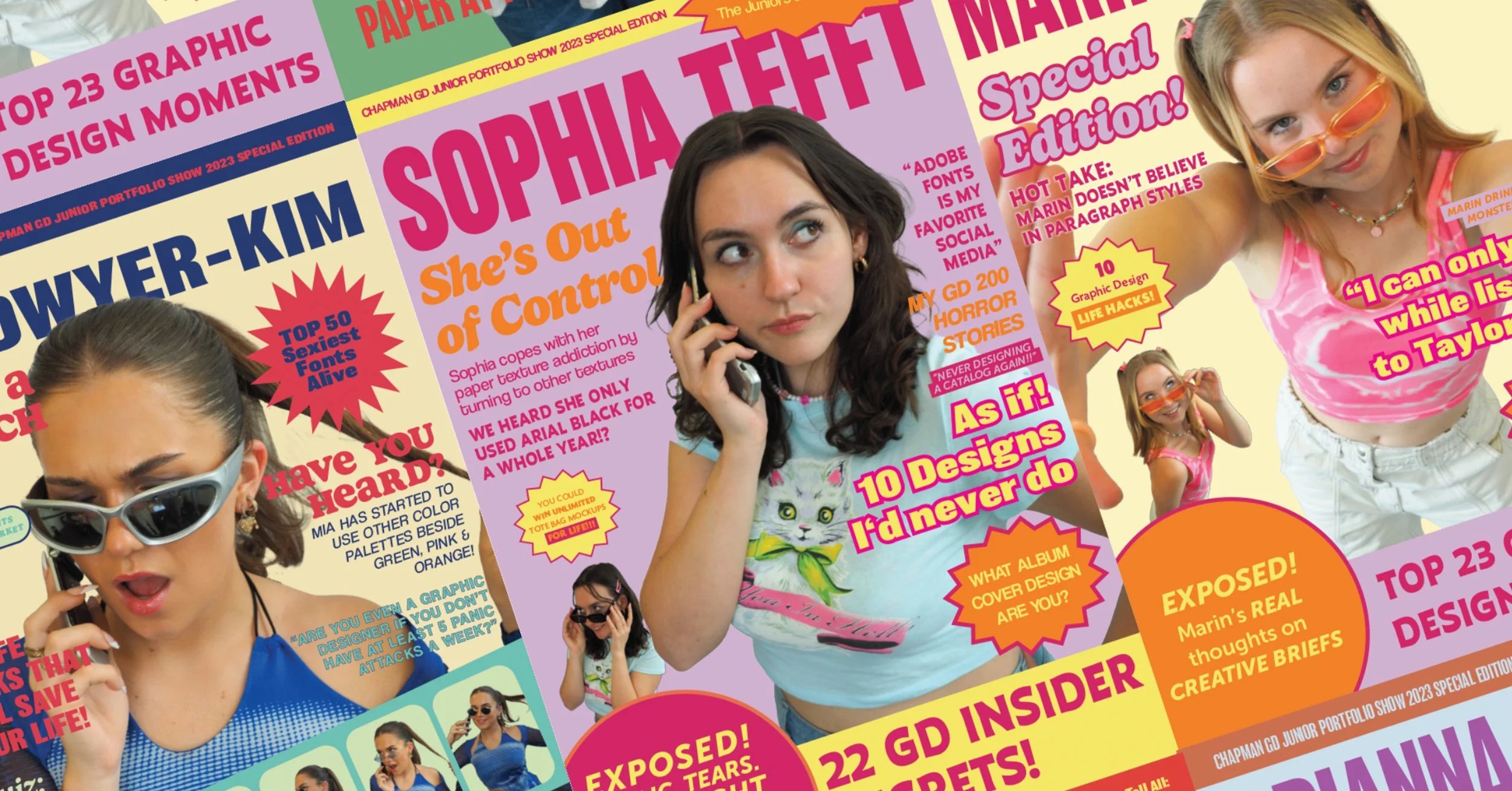 A gallery exhibition showcasing the Junior class graphic design majors at Chapman University, titled “Graphic Design Tell All: THE JUNIORS ARE A HOT MESS!” The theme was based on early 2000s pop tabloids and gave each student the opportunity to tease their “design secrets.” This was a collaborative project featuring Oona Clarke, Mia Dwyer-Kim, and Sophia Tefft as co-directors.